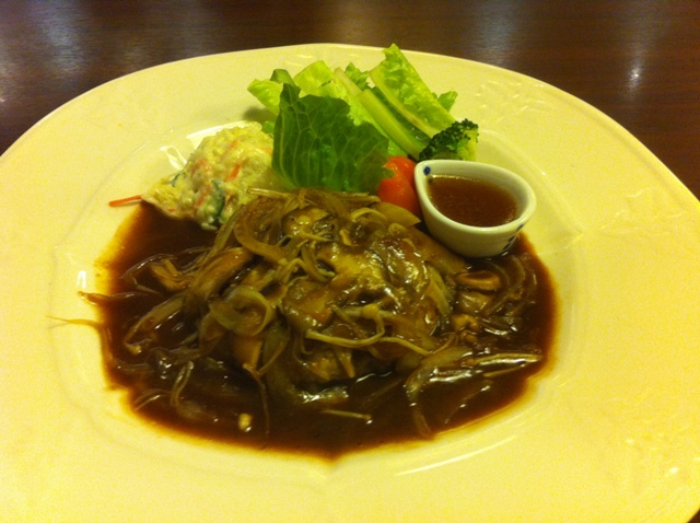 ----- จากนั้นไม่นาน "แฮมเบิร์ก ราดซอสเห็ด" ก็ยกมาพร้อมกับเซ็ตของเขา มีข้าวเปล่า, ผักดอง, มิโสะซุป และไข่ตุ๋น ครับ