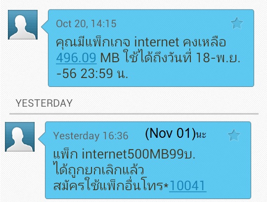 แล้วปรากฏว่าเมื่อวาน (วันที่ 1 พย. 56) มี SMS ส่งมาหาผม แจ้งว่าได้ถูกยกเลิกแพ๊กเกจ ใครเจอแบบนี้บ้างครับ (ขาดทุนไปตั้ง 20 วันแน่ะ เพิ่งใช้ได้ 10 วันเอง)