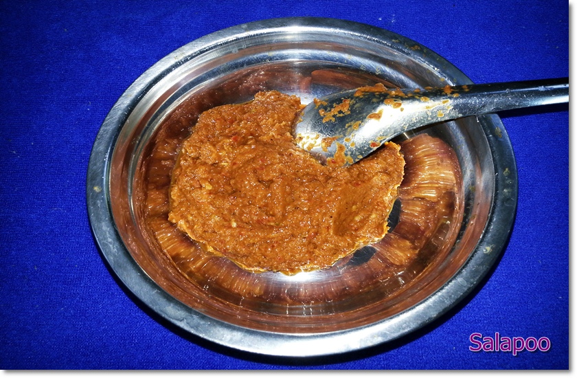น้ำพริกใช้น้ำพริกแกงเผ็ด แต่เน้นเครื่องปรุงกลิ่น ผิวมะกรูด เม็ดผักชี ยี่หร่ามากหน่อย