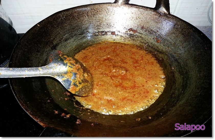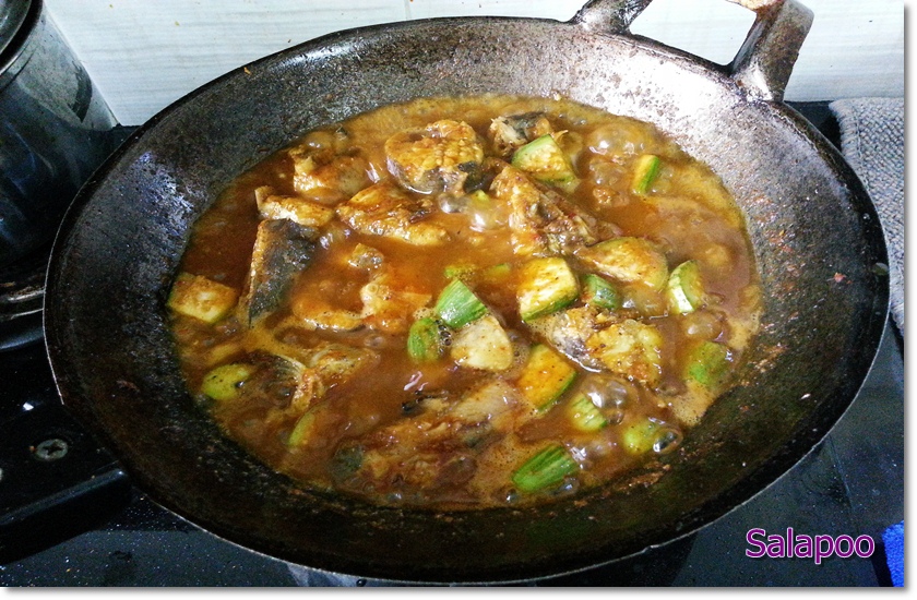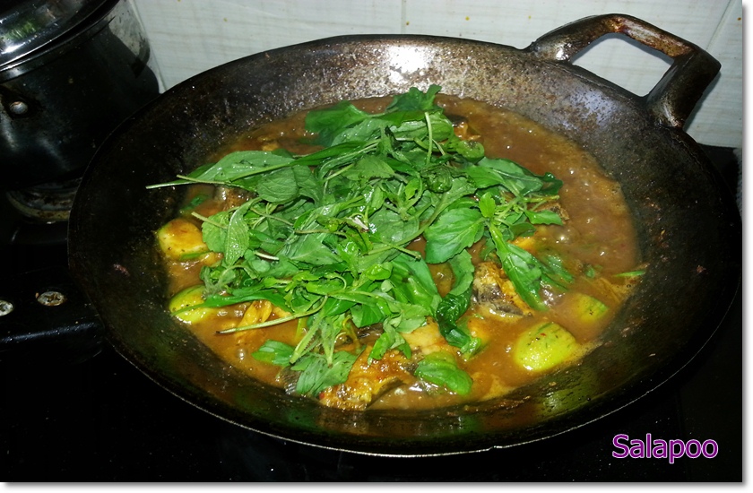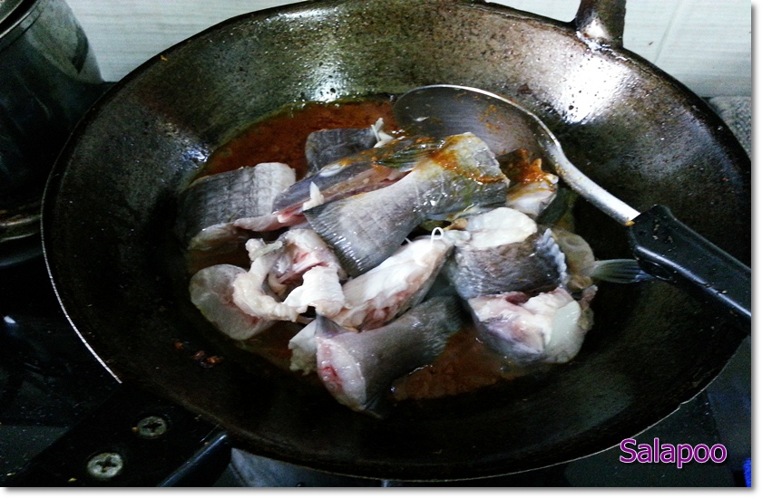 ผัดจนน้ำพริกหอมได้ที่เอาปลาลง ผัดกลบให้เข้ากัน เติมน้ำแกงทิ้งไว้รอสุกอย่างเดียว