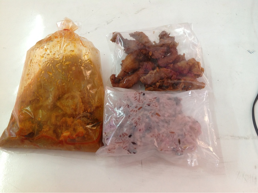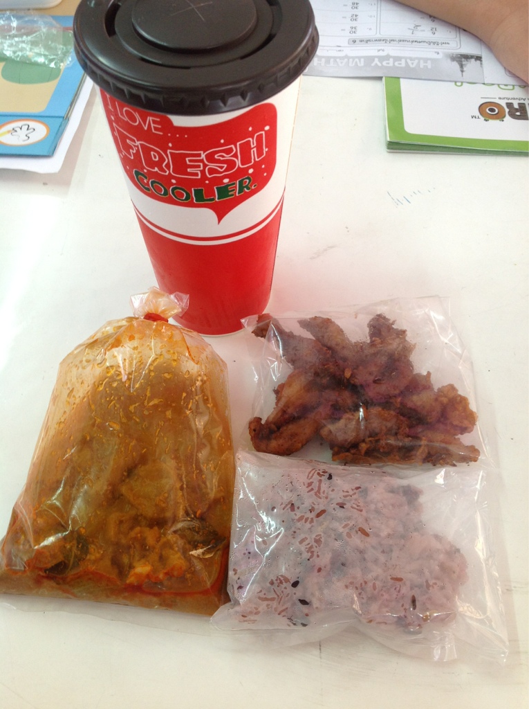 ช่วงเวลาเร่งรีบระหว่างจะไปโรงเรียน ก็ได้ซื้อข้าวกล่องมาและกไปเห็นหมูย่าง ที่ขายในร้านเดียวกัน ก็เลยบอกแม่ค้าว่าเอาหมูย่าง 1 ไม้ใส่ถุงด้วยแต่ดูแม่ค้าใส่ถุงมา