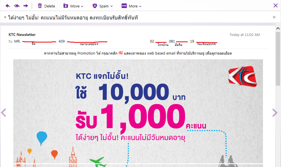 บัตรเครดิต KTC ส่ง newsletter มาทาง email มีข้อมูลหมายเลขบัตร วันเกิด เบอร์โทร (มีรูป) >> ช่วยแก้ไขด้วยครับ