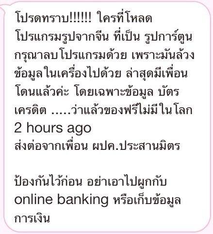 เริ่มมีการ ส่งข้อความ ฟอร์เวิท ในลาย แล้วก็ เฟสบุค ว่า โปรดทราบ!!!!!! ใครที่โหลดโปรแกรมรูปจากจีน ที่เป็น รูปการ์ตูน กรุณาลบโปรแกรมด้วย เพราะมันล้วงข้อมูลในเครื่องไปด้วย ล่าสุดมีเพื่อนโดนแล้วค่ะ โดย