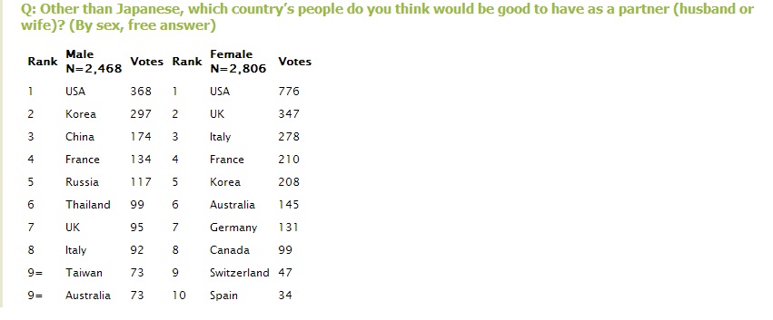 อันนี้เป็นโพลที่ถามคนญี่ปุ่นว่า จะเลือกแต่งงานกับคนชาติไหนนอกจากญี่ปุ่นด้วยกันเอง
