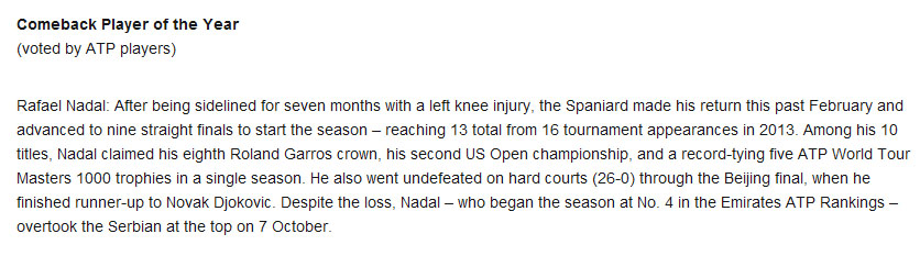 Rafael Nadal wins "Comeback Player of the Year" ...2013 ATP World Tour Awards