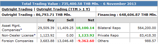 เว็บไซต์ตลาดหลักทรัพย์แห่งประเทศไทย รายงานสรุปการซื้อขายหลักทรัพย์ โดยแบ่ง ตามประเภทนักลงทุน ประจำวันที่ 27 กุมภาพันธ์ 2557 ดังนี้ กลุ่ม ปริมาณซื้อ % ปริมาณขาย % สุทธิ (ลบ.) (ลบ.) (ลบ.) นักลงทุนสถาบั