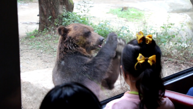 และไฮไลท์อีกฝ่ายสำหรับซาฟารีของสวนสนุกแห่งนี้ก็คือ ไกด์หรือคนขับรถจะทักทายหมี ให้อาหารมันแล้วก็ให้มันทำท่าไหว้ทักทายผู้ชมด้วย (จริงๆ ก็ยกมือทักทายอะนะ) แปลกตามากๆ ครับเพราะยังไม่เคยเห็นหมีทำท่าขออะไรแบบนี้มาก่อนเลย