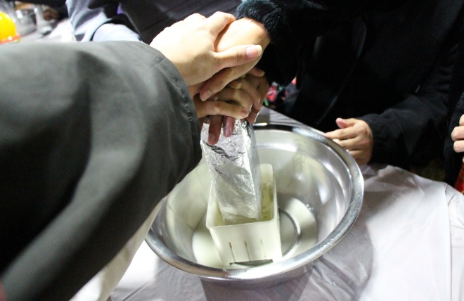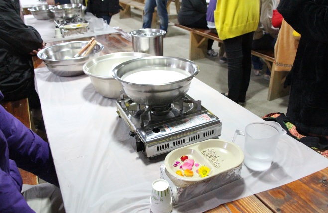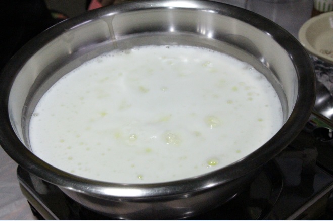 วิธีการทำก็เอาทัพพี (มั้ง) คนในหม้อนมสดแบบไป – กลับช้าๆ เรื่อยๆ พอเริ่มร้อนก็ใส่เจลาตินลงไป ตั้งไปจนเรื่อยๆ จนกว่ามันจะเดือด แล้วก็หรี่ไฟให้เบาลง จากนั้นอาจุงม่าจะเอาผลรสเลมอนหรือสเตอร์เบอร์รี่มาให้เราเลือกว่าจะเอาซีสรสอะไร (เราเลือกเลมอน) จากนั้นก็ตักเอามาใส่ในผ้าขาวบาง (มั้ง) แบบนี้