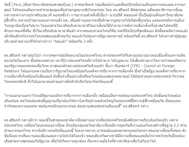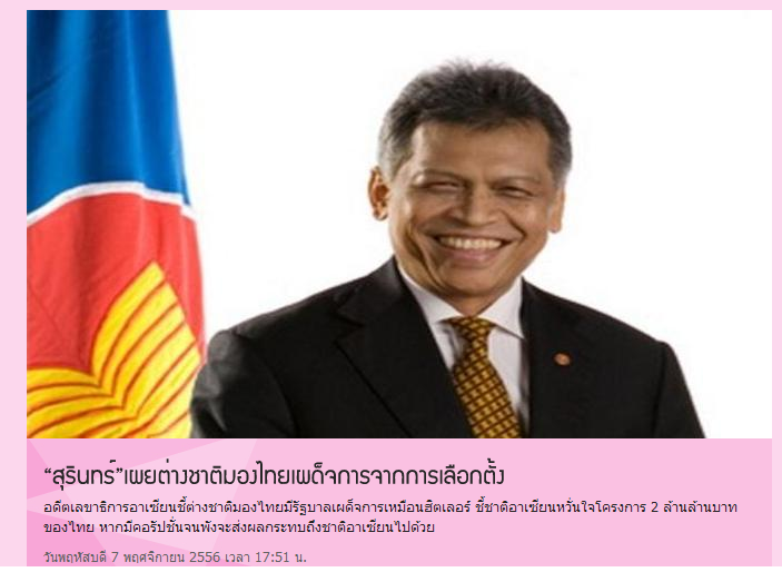 "ผมรอวันนี้มา 5 ปี นานาชาติไม่เอารัฐบาลนี้ตั้งนานแล้ว เขารู้ว่าประเทศไทยมีรัฐบาลเผด็จการที่มาจากการเลือกตั้งเหมือนอย่างฮิตเลอร์ วันนี้คนไทยเพิ่งตื่น" - ดร.สุรินทร์ พิศสุวรรณ เลขาธิการอาเซียน