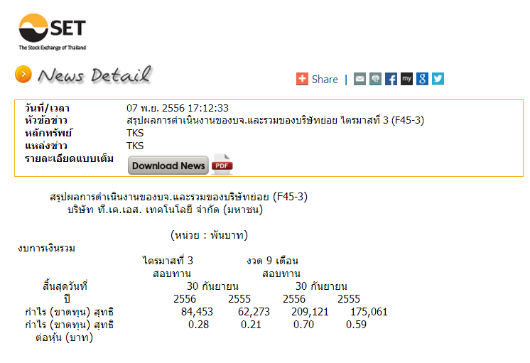 สรุปผลการดำเนินงานของบจ.และรวมของบริษัทย่อย (F45-3) บริษัท ที.เค.เอส. เทคโนโลยี จำกัด (มหาชน) (หน่วย : พันบาท) งบการเงินรวม ประจำปี ตรวจสอบ สิ้นสุดวันที่ 31 ธันวาคม ปี 2556 2555 กำไร (ขาดทุน
