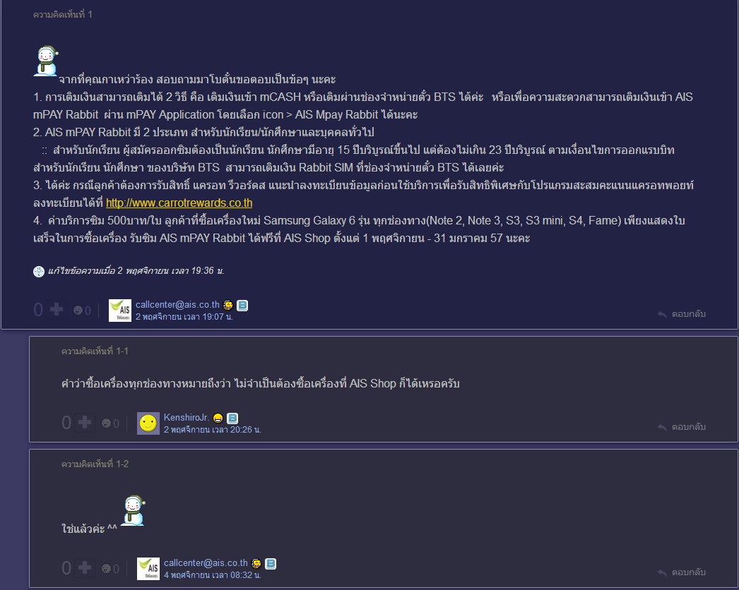 เมื่อเย็นของวันที่ 7 /11/2013 ผมได้ซื้อ Samsung Galaxy Note 3 จากร้านที่เป็นตัวแทนของ Samsung ที่ CDC ขากลับบ้านตอนหัวค่ำผ่าน เซ็นทรัลลาดพร้าวเลยแวะไปเปลี่ยนซิมเป็นไมโครซิมที่ AIS เซ็นทรัลลาดพร้าว เพราะปกติใช้ Iphone 5 ซึ่งเป็นนาโนซิม เห็น AIS กำลังโฆษณาเกี่ยวกับ Rabbit SIM ก็เลยสนใจไหนๆจะเปลี่ยนซิมก็เลยเปลี่ยนเป็น ซิมนี้เลย ตอนระหว่างทำซิม พนักงาน เหมือนยังไม่ค่อยเข้าใจในรายละเอียดของซิมตัวนี้เท่าไหร่ ขั้นตอนนี้มีพนักงานร่วมกันทำประมาณ 3 คน พนักงานแจ้งว่า เปิดซิมใหม่ ค่าซิม 500 บาท ผมบอกว่าผมมีเบอร์อยู่แล้ว ไม่ได้เปิดใหม่ พนักงานก็ไม่แน่ใจเดินไปถามๆกันดู สรุปได้ว่า มีเบอร์อยู่แล้วเสียแต่ค่าเปลี่ยนซิมเหลือ 400 บาท โอเค เปลี่ยนก็เปลี่ยน ด้วยความที่รอนานมากแล้วก็เลยไม่อยากเสียเวลา ก็เลยเสียเงินไป 400 เป็นค่าเปลี่ยนซิม ไม่เห็นพนักงานแจ้งเลยครับว่า ถ้าลูกค้าที่ซื้อเครื่องใหม่ Samsung Galaxy 6 รุ่น ทุกช่องทาง (Note 2, Note 3, S3, S3 mini, S4, Fame) สามารถรับซิมได้ฟรี ทั้งๆที่ผมก็ถือถุงเครื่องใหม่ไปด้วย กะว่าจะเปลี่ยนซิมเสร็จแล้วใช้งานทันที แต่ด้วยความที่นานมาก เหมือนพนักงานยังไม่ค่อยรู้เรื่องเกี่ยวกับซิมตัวนี้ ผมเลยรีบออกมา เพราะใช้เวลาเกือบชั่วโมงกับการเปลี่ยนซิมแค่ใบเดียว