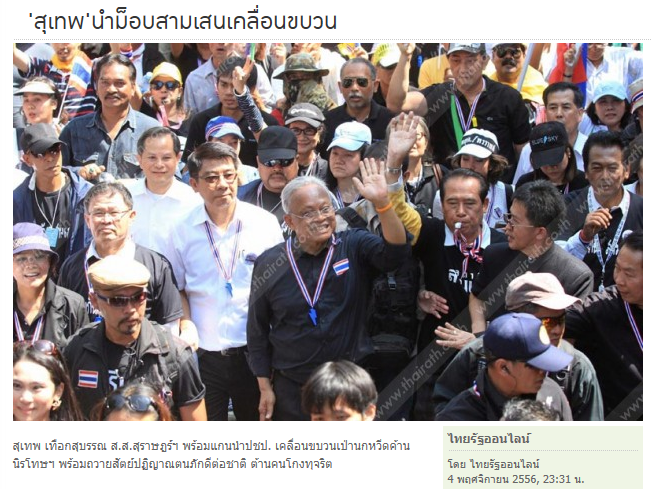 Linkข่าวไทยรัฐonline : สีสันม็อบ http://www.thairath.co.th/content/pol/394346 ประมวลภาพเชิญชวนปชช. ชาวฝั่งธนบุรี ลูกหลานพระยาตาก ออกมาสนับสนุนเงินในการเป็นกบฏ เป็นเงิน2.5mb (ห้าแสน สองล้านกว่าบ