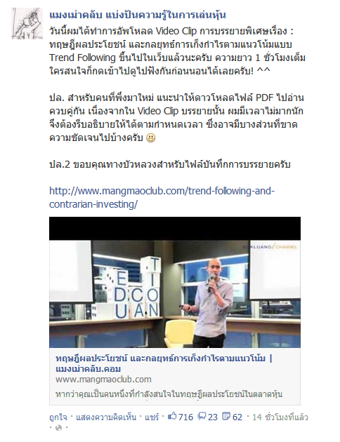 http://www.youtube.com/watch?v=ZFs47cjBtLg หนังสือประกอบที่แกพูดครั้งนี้ครับ ทฤษฎีผลประโยชน์ และกลยุทธ์การเก็งกำไรตามแนวโน้ม - แมงเม่าคลับ พอเห็นแบบนี้ นักเทคนิคที่เล่นระยะกลางถึงยาวจะยังจะมีคนก