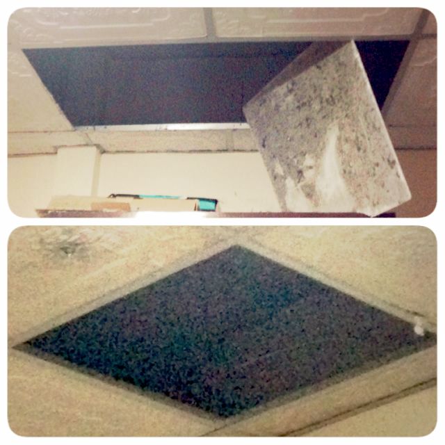สวัสดีค่ะ ภาพที่เห็นคือสภาพฝ้าที่ร่วงค่ะ ฝ้าที่ร่วงลงมามีลักษณะเหมือนกระดาษเลยค่ะ ตกลงมาก็หักพังเลย แมวที่บ้านขึ้นไปใต้หลังคา แล้วกระโดดลงมา จนร่วงและพังดังรูปที่เห็น