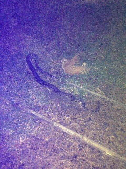 ช่วงหัวค่ำ หลังจากได้ยินเสียงผิดปกติจากท้ายอู่ เห็นแล้วว่าใช่แน่ๆตะโกนเรียกพรรคพวกจากหน้าบ้าน คว้าไม้มาคนละท่อน ภาพที่เห็นคือแมวเหลืองนอนหงายท้องสี่ขาชี้ขึ้นฟ้า โดนงูรัดพันรอบตัวเป็นภาพที่น่ารันทดมากๆ พวกผมกระหน่ำตีไปที่หัวงูและลำตัวหมายให้มันปล่อยตัวจากแมว มันปล่อยครับหลังจากโดนไปหลายบึ้ก แต่มันสู้ครับ แว้งฉกขึ้นมากัด มีเสียงดังฟู่ด้วย ชัดเจน และกว่าจะเอามันอยู่ไม่ง่ายครับกระหน่ำตีกันสองคน มันยังเลื้อยหนีได้เลื่อยๆแต่ไปแบบเป๋ๆ สุดท้ายโดนปืนลูกกลด กดเข้ากลางหัวระยะประชิด เหลือมสิ้นฤทธิ์ตามรูป แต่ไม่ทันการแล้วครับแมวเหลืองโดนงูรัดตายน่าสงสารมาก ตัวนิ่มย้วยไปหมดทั้งตัวเลย ไปดีนะแมวเหลือง พวกพี่ขอโทษด้วยที่มาช่วยเอ็งไม่ทัน