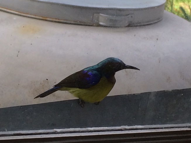 ส่วนตัวที่สองนกกินปลีคอสีน้ำตาล (ตัวผู้) นกกินน้ำหวานดอกไม้และบางครั้งก็หนอน แมงมุม เป็นนกหัวถิ่น ที่มาจิกกระจกเพราะนึกว่านกตัวอื่นเลยมาไล่ (โธ่ ไม่รู้รึไงว่านั่นนะตัวเอง)