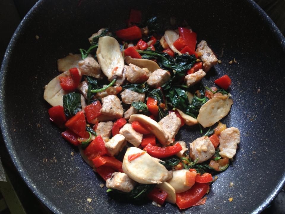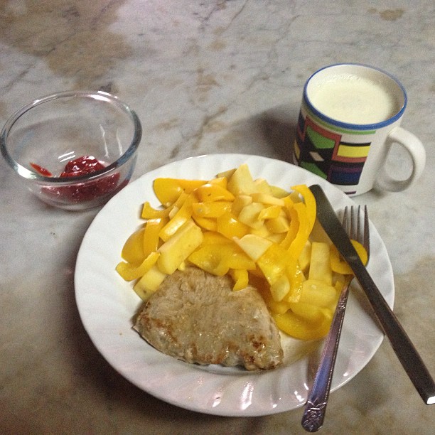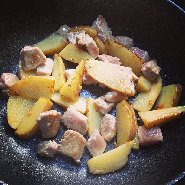 เนื้อหมูสันนอก หมักใส่ซีอิ้ว น้ำมันหอย น้ำมันมะกอก เหล้านิดนึง บางครั้งก็หั่นลูกเต๋าแบ่งเป็นชุดๆ ตื่นเช้าออกกำลังกายเสร็จก็จำใส่กระทะเทฟลอนผัดๆ(ไม่ต้องใส่น้ำมันครับ ในเนื้อหมักด้วยน้ำมันมะกอกอยู่แล้ว) ใส่มันฝรั่ง และ พริกหวาน ผักโขม ผัดสักครู่พอสุกก็เอาใส่จานเลยครับ ผมไม่ปรุงอะไรเลยนะครับ ชอบเวลาได้รสชาติที่มันเป็นรสของวัตถุดิบนั้นๆแบบธรรมชาติๆ