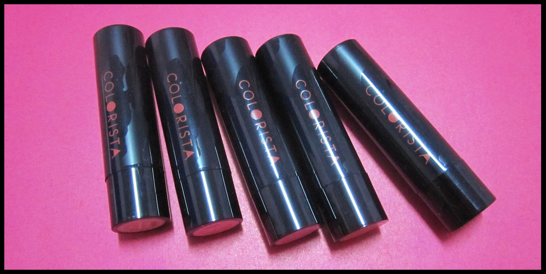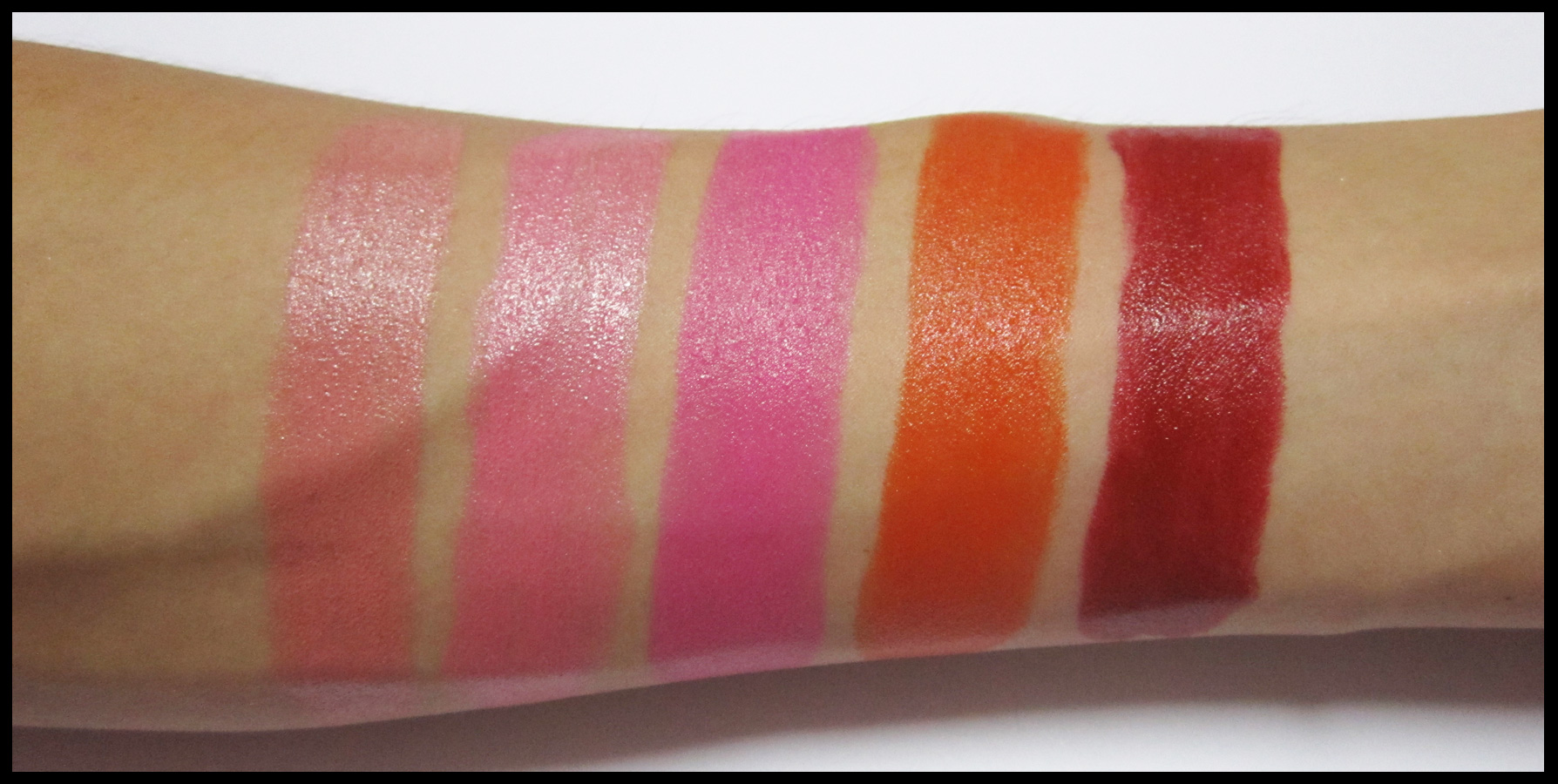 Swatch สีจากซ้ายไปขวา : Sugar Nude / Milky Pink / Crazy Pink / Bright Orange / Red Berry