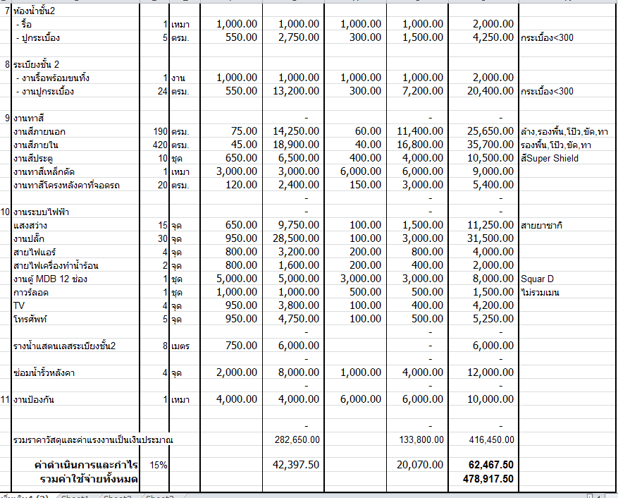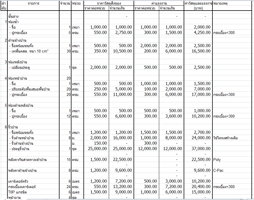 อยากซ่อมแซม + ต่อเติม บ้านแฝด 3 ชั้น ผู้รับเหมาส่งใบเสนอราคาตามรายการด้านล่าง รายละเอียดบางส่วนตกหล่นไปบ้าง เช่น ขนาดช่องไม้ แต่อยากได้ความคิดเห็นในภาพรวมค่ะ ส่วนใหญ่เป็นค่าแรงช่างค่ะ วัสดุส่วนใหญ่ให