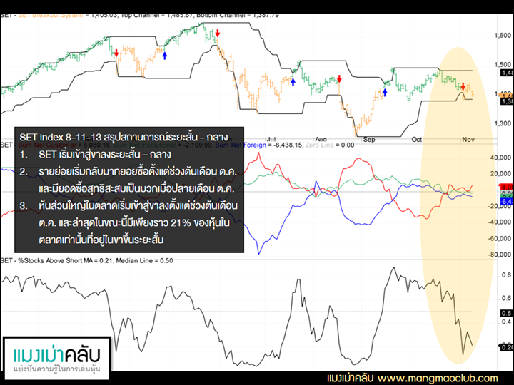 สรุปสถานการณ์ในระยะสั้นจากข้อมูลวันศุกร์ที่ 8-11-13 (คำนวณด้วย Period ที่ 25 วันย้อนหลัง)