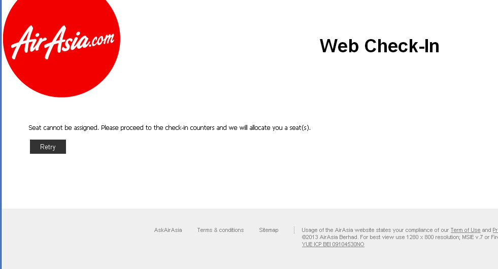 "Seat cannot be assigned. Please proceed to the check-in counters and we will allocate you a seat(s)"