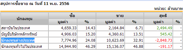 Sinthorn Summary 11/11/2556 : ต่างชาติขายสุทธิ -2,848.73 ลบ.