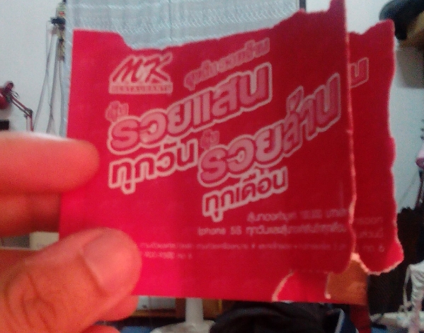 แต่จับมา ได้ เป็นซองเล็กๆ แกะมา เจอหมายเลข xxxxxxx ต้องส่งเป็น sms ไปลุ้นอีกรอบ