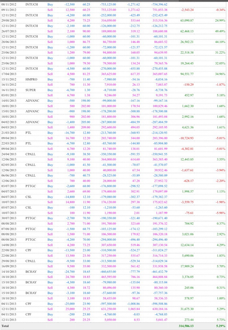 ปีนี้เลยลองเปลี่ยน เมื่อเรารู้ว่า เราถือแล้วหุ้นขึ้น ยาวแล้วตก เราก็ขายทำกำไร ชักเข้า ชักออกในรอบเดือน ทั้งปี 2013 ผลปรากฏว่า