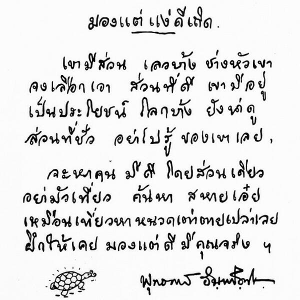 มองเมฆอรชรร่อนเรียงอยู่มองอุษาอ่าแสงแจ้งดำรูมองผาภูผ่องผาดเพียงดาดทอง"นั่งมองคลื่นรื่นเร่ห้อมเห่ฝั่งพร่ำฝากฝังภักดีไม่มีสองดวงดาวเฟี้ยมเยี่ยมพักตร์ลักษณ์ลำยองจากคันฉ่องชลาลัยใสสะอาง""นั