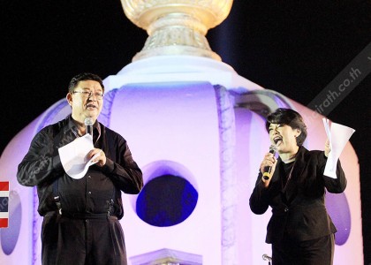 จากนั้นในเวลา 21.50 น. นายเจิมศักดิ์ ปิ่นทอง และนางอัญชลีพร กุสุมภ์ ได้ขึ้นเวทีจัด