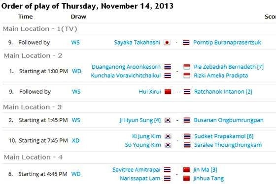 รายชื่อนักกีฬาไทยที่เหลือในวันที่ 21 พย. 2556 เชคผลการแข่งขันและเวลาการเเข่งขัน http://www.tournamentsoftware.com/sport/matches.aspx?id=CB06A499-97EF-4885-AA68-2CEAAB2DAE21&d=20131121 Live sco