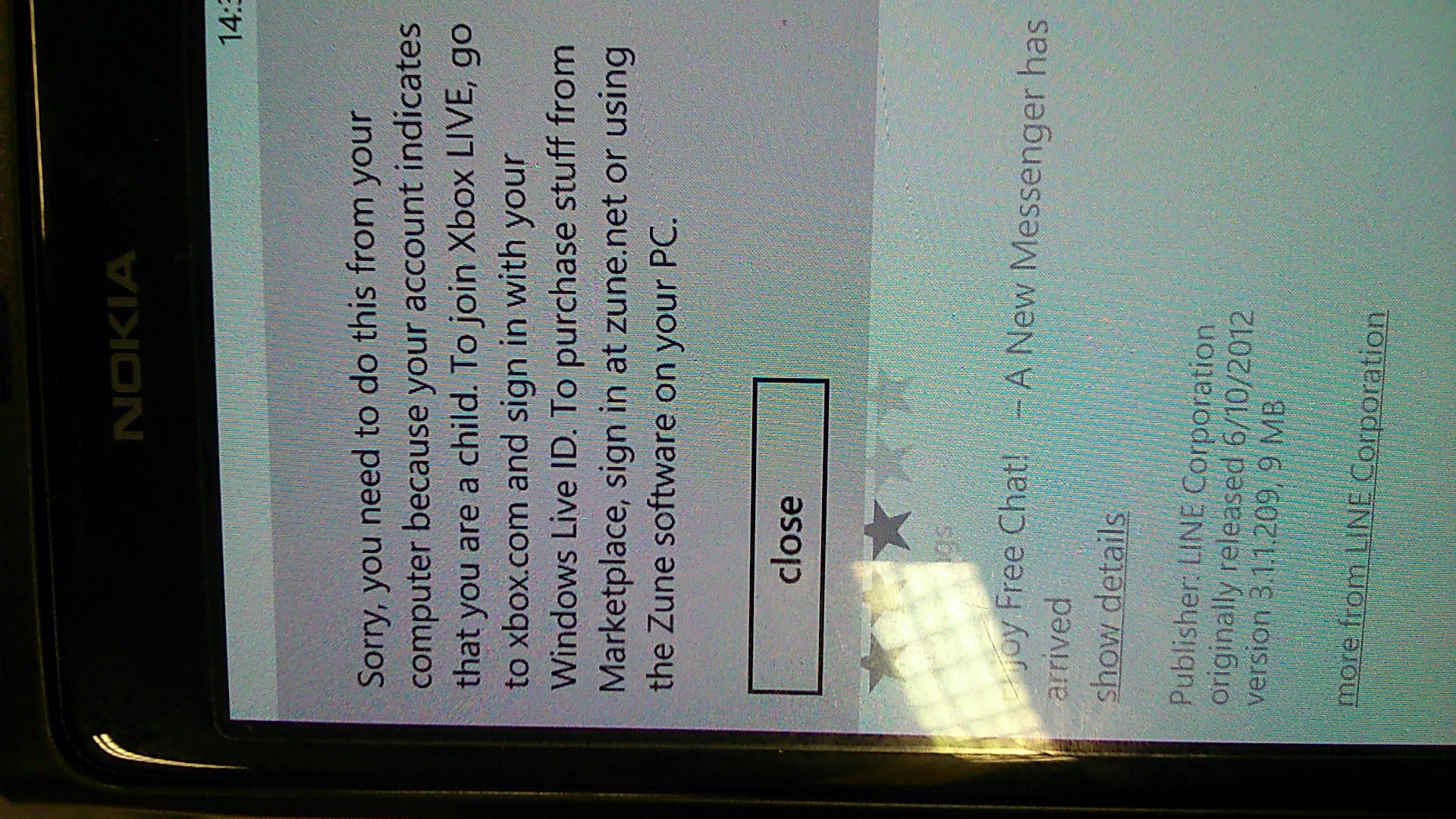 พอดีเพื่อนฝากถาม รู้สึกว่าจะเป็น Lumia800 วินโดร์7.5 ผมลองโหลดLine มาก็ไม่ได้ มันขึ้นตามภาพล่างนี้อ่ะครับ หรือว่าต้องมีการสมัครอะไรผ่านPC ก่อน