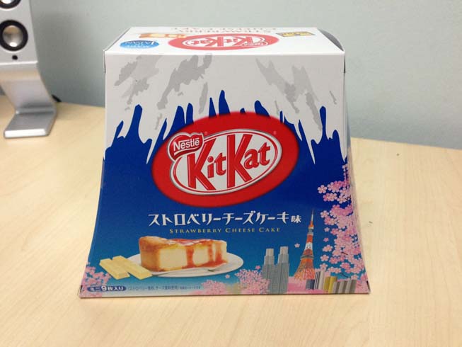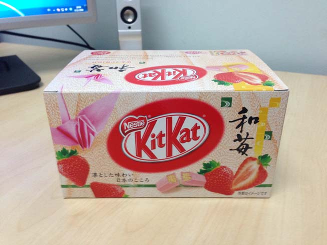 7. Kitkat ชาเขียว, Kitkat Strawberry, Kitkat ซากุระ Strawberry กล่องเล็ก มีหลายกล่อง ราคากล่องละ 90 บาท