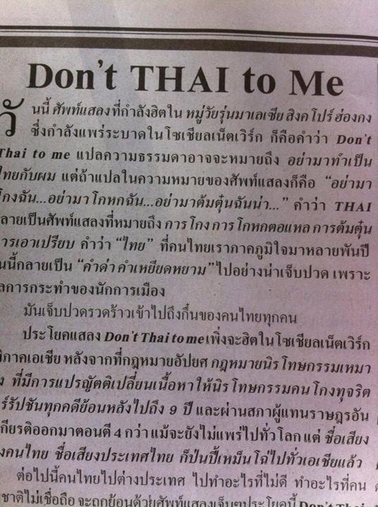 Don t THAI to me ในโซเชียลเน็ตเวิร์ก หมายถึง ขอผู้รู้ช่วยที่ จำได้ว่า มันเป็นความหมายที่ คนฟิลิปปินส์ คนหนึ่งให้ความหมายของ คนไทยไว้ ในโซเชียลเน็ตเวิร์ก แต่เห็น ลมเปลี่ยนทิศ มาให้ความหมายไว้ว่า วัยรุ่