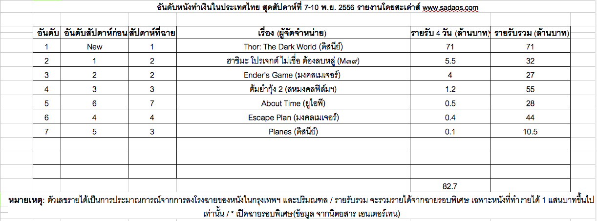 ไม่มีอะไรผิดเพี้ยนไปจากที่คาดการณ์กันไว้ คิดๆ ไปแล้ว หากแทงหวยแม่นแบบนี้ นายสะเด่าส์ก็คงรวยไปนานละ เมื่อ Thor: The Dark World ขึ้นแป้นอันดับ 1 ด้วยรายได้มหึมา 71 ล้านบาทซึ่งก็เกือบเท่ากับรายได้ที่หนังภาคแรกทำเอาไว้ตลอดโปรแกรมเลยทีเดียว โดยรายได้ของ Thor: The Dark World นั้น มากถึง 86% ของรายได้รวมของหนังที่ทำเงินถึง 1 แสนบาททั้งหมดเลยทีเดียว