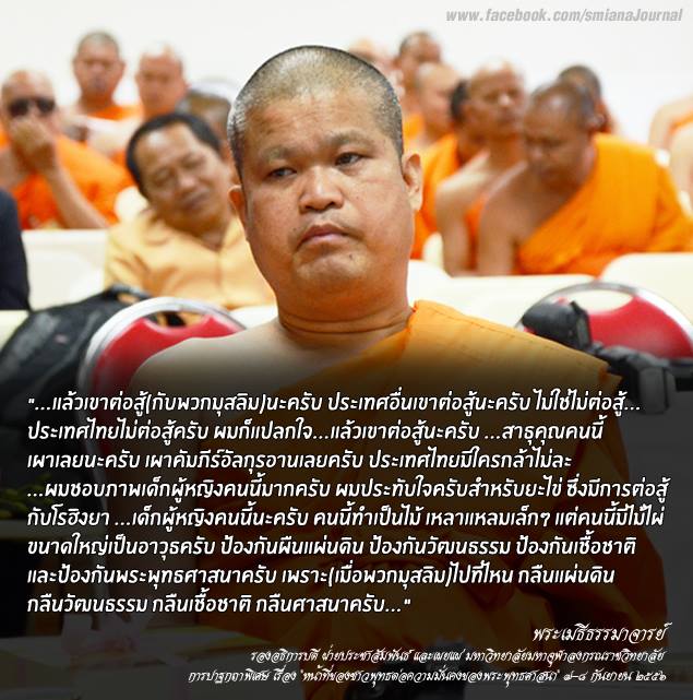 ขณะเดียวกันก็พยายามชี้ให้เห็นถึงการขยายตัวของมุสลิมในประเทศไทยนั้น เป็นภัยคุกคามที่อันตรายต่อชาวพุทธและลงท้ายด้วยการตั้งข้อสังเกตว่า ทำไมคนไทยไม่ลุกขึ้นสู้กับพวกมุสลิม!