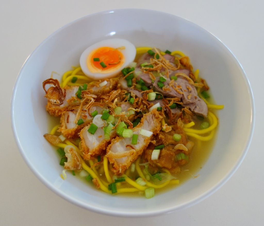 ลวกบะหมี่เส้นใหญ่ (บะหมี่ฮกเกี้ยน หรือ เส้นราเมน) ใส่น้ำซุปและเต้าเจี้ยว โรยหน้าด้วยขาหมู หมูทอดทงคัตสึ และ ไข่ต้มยางมะตูม