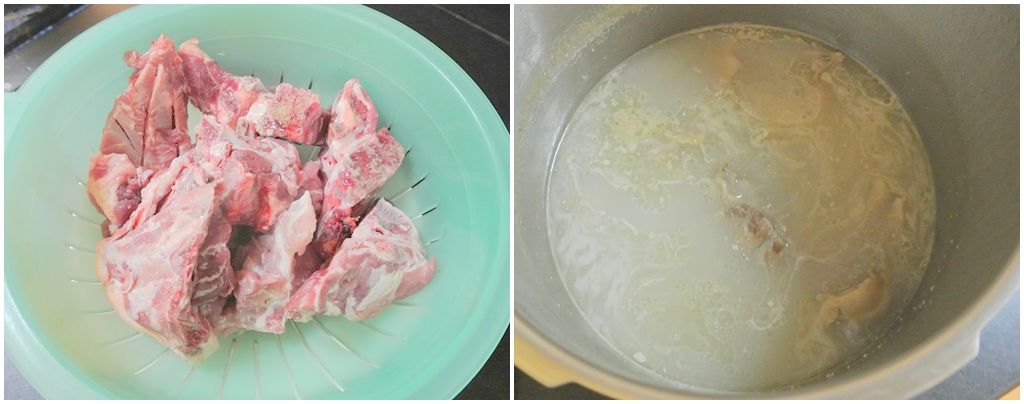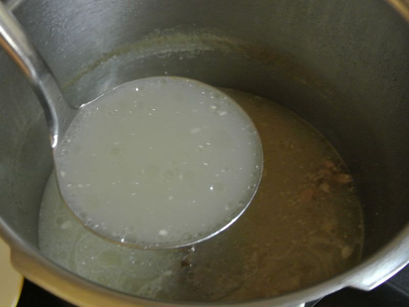 กระดูกหมูสันหลัง นำไปลวกน้ำร้อน แล้วไปต้มในหม้อความดัน ใช้เวลาต้ม 2 ชั่วโมง ได้น้ำซุปที่ข้น ข่าวขุ่น ใช้แก้ขัดได้