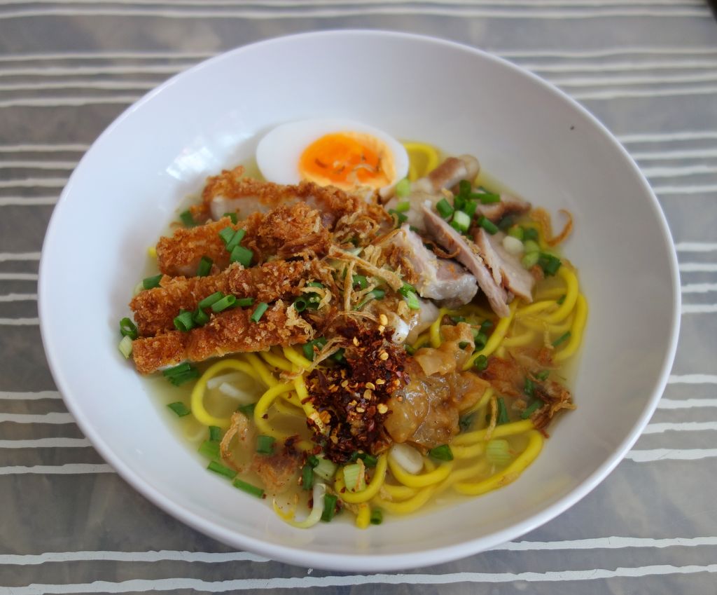 หน้าก็ใช้ เนื้อขาหมูไปต้นให้เปื่อย แบบ ก๋วยเตี๋ยวของเวียดนาม ใส่หมูทอด-ทงคัตสึด้วย และ ไข่ต้มยางมะตูม