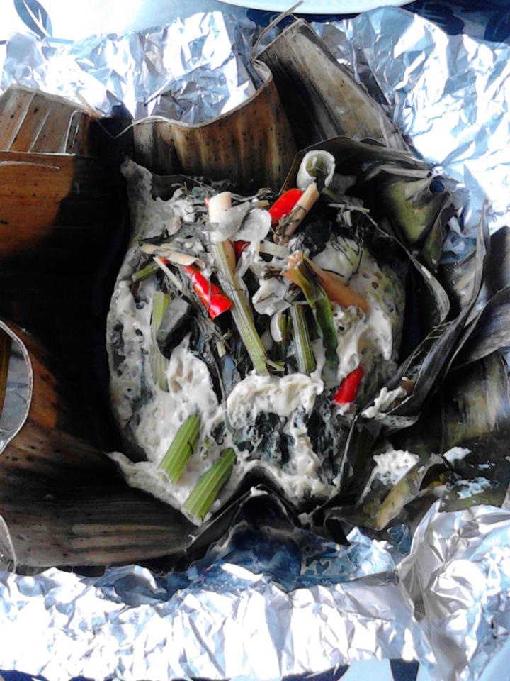 ห่อหมกปลา ใบตองมีใบเดียวก็ใส่มันลงไปพอให้มีกลิ่นใบตองแล้วใช้แผ่นโฟลีโอบความหอมเอาไว้ก็โอค่ะ