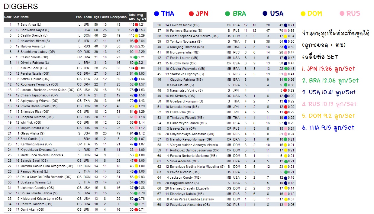 สถิติการขุด หรือ พูดตรงๆ ความเหนียวของสาวไทยสำหรับ ทัวร์นี้ ได้อันดับสุดท้ายครับ แพ้โดมินิกันแบบฉิวเฉียด เอกลักษณ์ และ จุดเด่นของสาวไทยเรา ในเรื่องความเหนียว ที่คู่คี่สูสีมากับทีมยุ่น ได้หายไปแล้ว (ส่วนนึงต้องยอมรับว่าการรวมทีมน้อยทำให้ ประสิทธิภาพทั้งเกมรุก และ เกมรับ หายไปอย่างชัดเจน การวางตำแหน่งในสนามไม่ดีเท่าที่ควร ต่างกับญี่ปุ่นที่ทำการบ้าน + ฝึกซ้อมมาอย่างดี ทำให้จุดเด่นเรื่องความเหนียวนั้น ยังแข็งแกร่ง และนำหน้าทีมอื่นๆไปไกลมากครับ หวังว่าใน tournament ต่อๆไปสาวๆของเราจะกลับมาคงความเหนียว ให้ดีและสูสีกับสาวยุ่นได้เหมือนเดิมนะครับ)