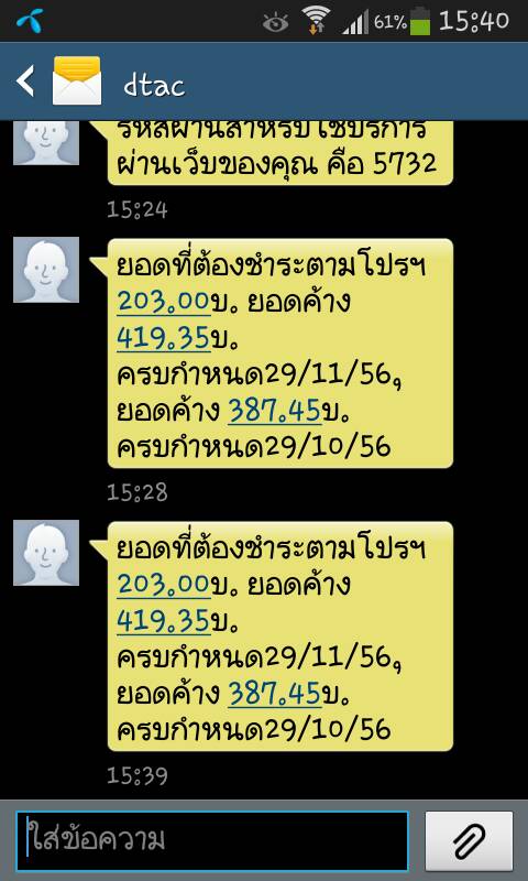 แก้ไข ผมมีคำถามครับ คือผมจ่ายรอบบิลรายเดือนของDtac ในวันที่24/09/56 ผ่าน เค้าส์เตอร์ 7-11 สำเร็จ!!แต่พอเช็ค *121# กลับมียอดค้างชำระบริการ 526 บาท ครบกำหนด ชำระ25/10/56 และมีค่าบริการตามโปร 468 บาท ผมอ