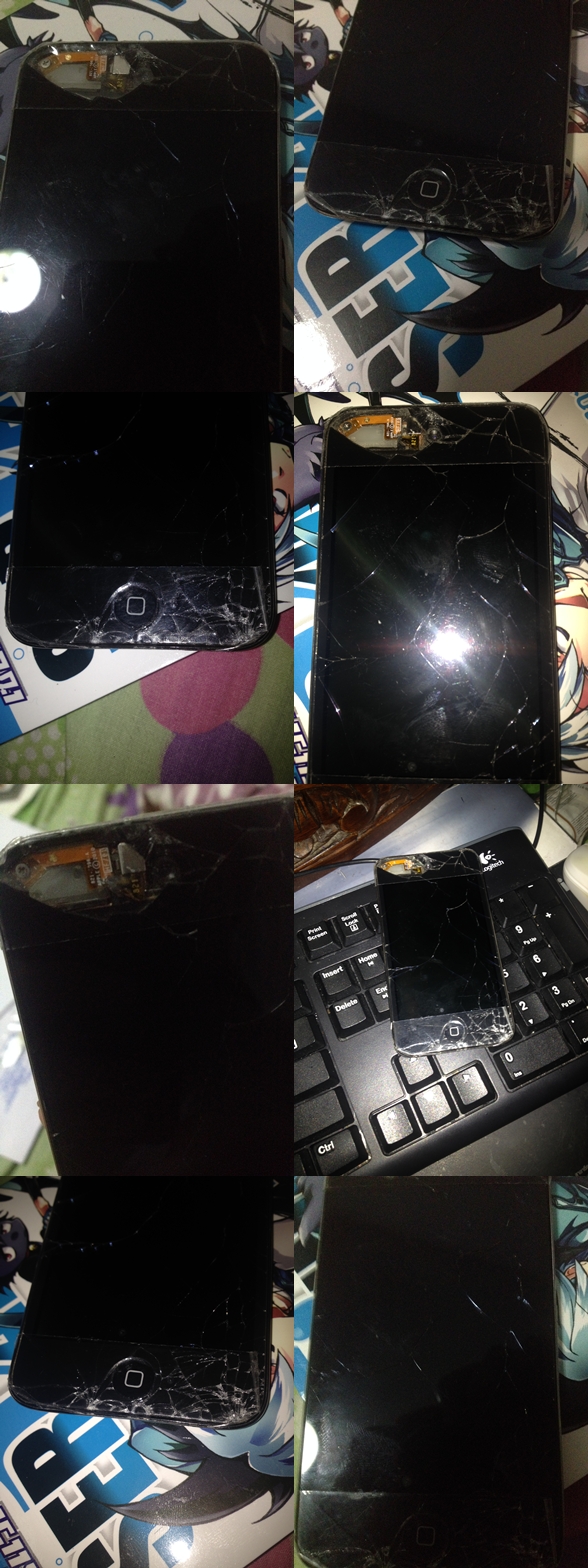 คือเมื่อก่อนใช้น้องพอตตี้ (Ipod touch gen 4) กับน้องติม (LG GD 350) ค่ะ โดยเมื่อก่อนก็ทำน้อง ๆ ทั้งสองร่วงทุกวัน ร่วงจากกระเป๋าเสื้ออะไรแบบนี้บ่อยเลยน่ะค่ะ แต่ก็ไม่เป็นอะไร จนกระทั่งเมื่อปลายปี 2555 ขณะกำลังฟังคุณครูร่ายอยู่หลังทำกิจกรรมหน้าเสาธงเสร็จเรียบร้อย น้องพอตตี้ก็ได้ร่วงจากบริเวณต้นขาใกล้ ๆ หัวเข่าค่ะ ตอนนั้นนั่งขัดสมาธิอยู่!! ไม่ได้คิดอะไรเลยตอนนั้น พอหงายขึ้นมาถึงทำจุกเบา ๆ เลยค่ะ แต่ยังใช้งานได้ปกติทุกประการนะคะ ใช้มาเรื่อย ๆ จนเมื่อไม่กี่เดือนที่ผ่านมาน้องพอตตี้ไม่สามารถโปเตโต้ทนพิษบาดแผลได้อีกต่อไป อาการเริ่มทรุดลง ๆ เรื่อย ๆ ค่ะ หน้าจอนี้เลื่อนไม่ไปเลย อารมณ์เสียมากค่ะ ซ้ำยังมีปัญหาที่ว่าเวลาเสียบหูฟังแล้วเสียงมันแตกค่ะ ลดไม่ได้ ต้องฟังทั้งดัง ๆ อย่างนั้นจนไม่สามารถรับได้ไหวอีกแล้ว เป็นตั้งแต่ซื้อมาแรก ๆ แล้วค่ะ แต่ไม่ได้เข้าศูนย์เพราะขี้เกียจและติดฟังเพลงมาก (ไม่น่าเลย TvT)