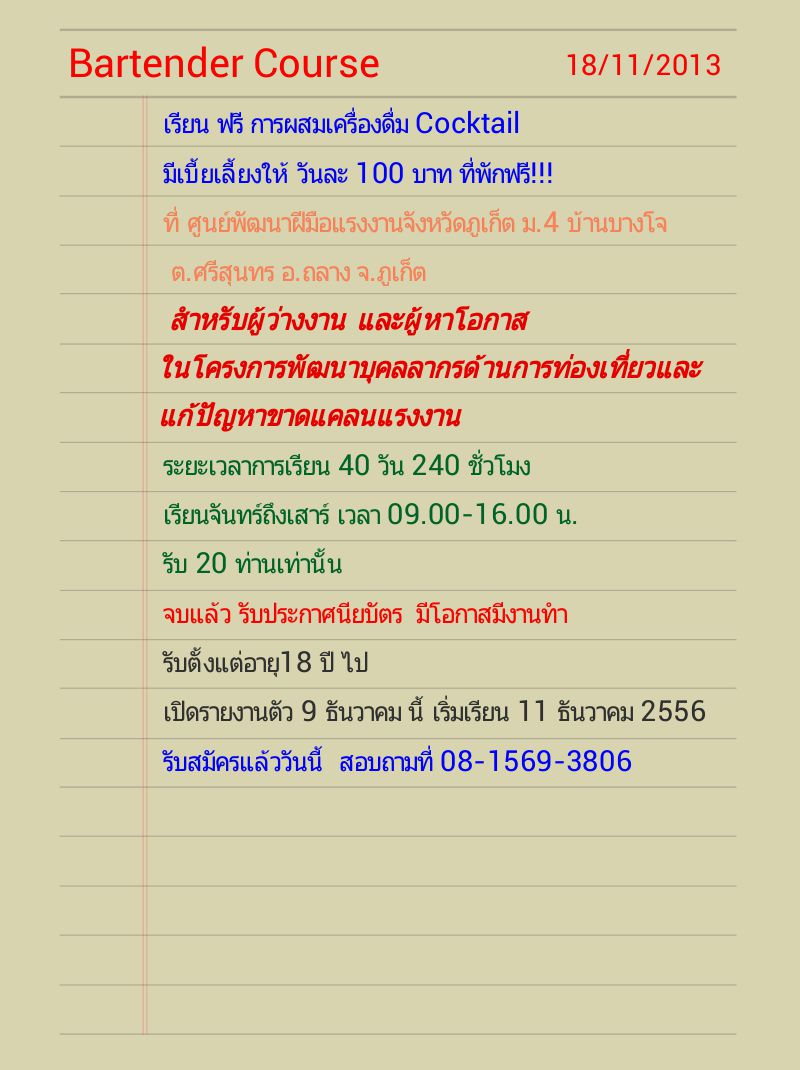ศูนย์พัฒนาฝีมือแรงงานจังหวัดภูเก็ต เปิดอบรม หลักสูตร การผสมเครื่องดื่มแบบมืออาชีพ ระยะเวลา 40 วัน หรือ 240 ช.ม. แก่ผู้ว่างงาน ผู้ประกอบการที่สนใจ ฟรี เริ่ม 1 พ.ย. นี้ โทรสอบถามได้ที่ 076-273470 เวลารา