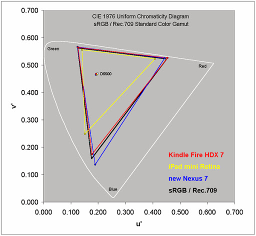 เมื่อมาถึงผลการทดสอบคุณภาพของหน้าจอทั้งสาม ปรากฏว่าตัวเต็งอย่าง iPad mini กลับเป็นรายที่ทำผลงานได้แย่ที่สุดทั้งการแสดงผลสีได้น้อยกว่าคู่แข่งอย่างมาก ทำให้ความแม่นยำของการแสดงผลนั้นตกลงไปด้วย ฝั่ง Nexus 7 นั้นทำได้ดีแทบทุกอย่างยกเว้นเรื่องของคอนทราสต์ที่มากเกินไป ส่วนแชมป์นั้นตกเป็นของ Kindle Fire ที่ทำผลงานได้ดีทุกทาง (DisplayMate ไม่ติอะไรเลย)