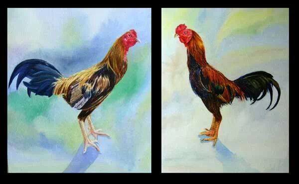 ภาพวาดสีน้ำพญาไก่ชน ใครจะชนะนะ