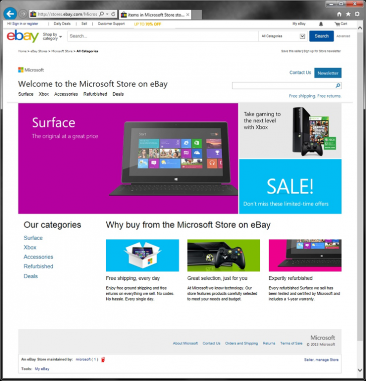 และแล้วก็เป็นคู่หูดูโอ้คนใหม่กันเรียบร้อยแล้ว สำหรับไมโครซอฟท์และอีเบย์ เมื่อมีรายงานว่า ไมโครซอฟท์ได้ฤกษ์เปิดตัว Microsoft Store เวอร์ชั่น eBay ในตลาดสหรัฐฯ ซึ่งเป็นอีกหนึ่งช่องทางการขายสินค้าของไมโครซอฟท์เช่นเดียวกับบนเว็บไซต์ microsoftstore.com โดยจะมีการนำเสนอการขายโปรดักส์ของไมโครซอฟท์ อุปกรณ์เสริมต่างๆ รวมถึงมีเงื่อนไขการคืนสินค้าและการจัดส่งฟรี เช่นเดียวกันกับ microsoftstore.com