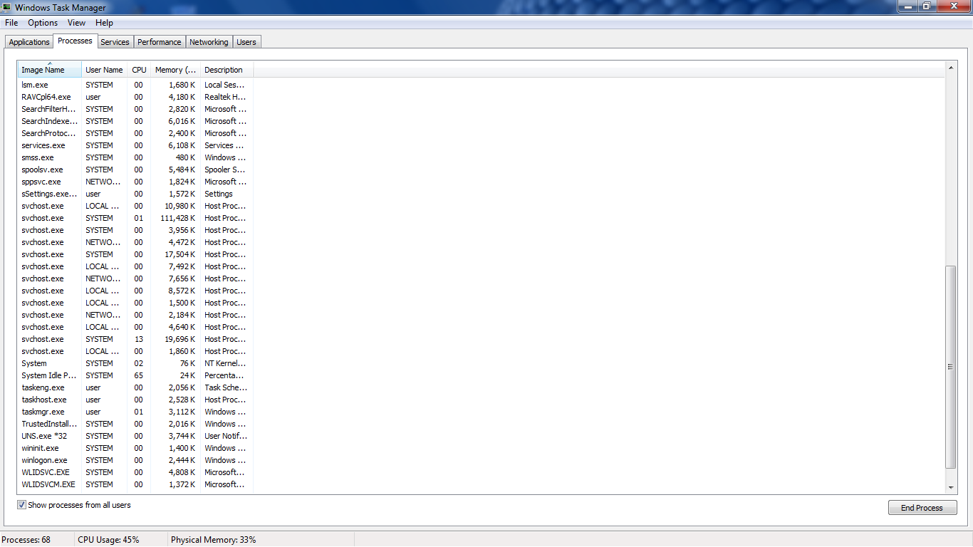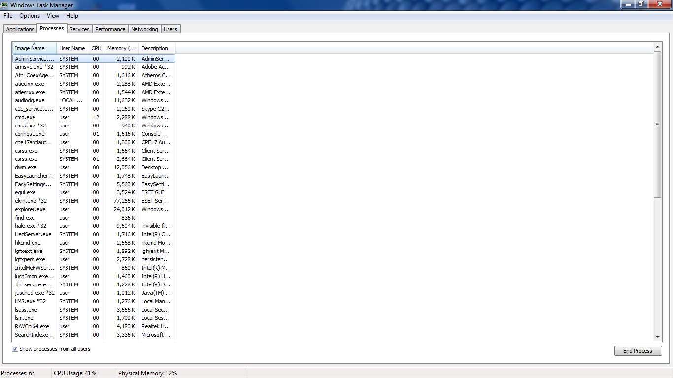ผมเพิ่งลง Windows 7 ใหม่หลังจากฟอร์แมตเครื่องเดิม.. ตอนแรกใช้งานอยู่และลงโปรแกรมนิดหน่อยไม่เป็นไร แต่พอลงโปรแกรมเพิ่มขึ้นพบว่าคอมช้ามากๆ เลยเช็คดูพบว่า CPU วิ่งเกือบ 100% ตลอดเวลา ลองดูที่ task manag