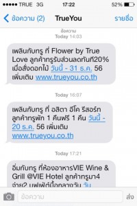 ส่งมาจนเป็น SMS ขยะ แล้วนะอยากจติดต่อไปให้บล็อค SMS ก็เดี่ญวข้อความสำคัญอื่นๆๆไม่เข้าอีก True Card TrueRed TrueMove H TrueSpecial TrueBill TrueYou TrueI