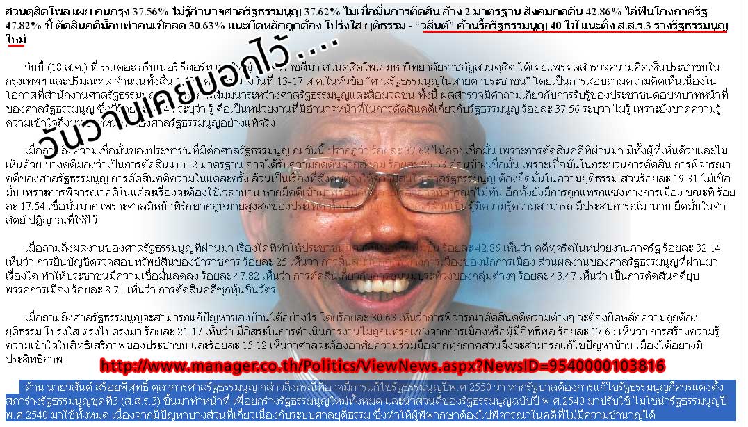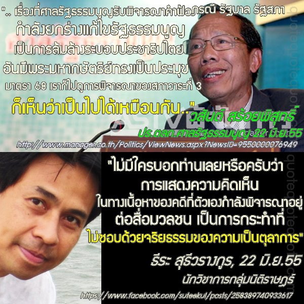 เมื่อวันที่ 21 พ.ย.เวลา 14.00 น. ที่หอประชุม เอสบีซี ฮอลล์ วิทยาลัยเซาธ์อีสท์บางกอก บางนา นายวสันต์ สร้อยพิสุทธิ์ อดีตประธานศาลรัฐธรรมนูญ ได้บรรยายพิเศษเรื่อง "ระบบยุติธรรมกับทางรอดของประเทศไทย" กล่าวตอนหนึ่งว่า ศาลรัฐธรรมนูญมีคำวินิจฉัยว่า คำร้องการแก้ไขรัฐธรรมนูญ ขัดต่อรัฐธรรมนูญ มาตรา 68 ถึงวันนี้ก็ยังคงมีคนพูดอยู่ว่า ศาลรัฐธรรมนูญ ไม่มีอำนาจรับคำร้องนี้ ต้องผ่านอัยการ รวมถึงมีการพูดว่า ศาลรัฐธรรมนูญไม่มีอำนาจรับ เพราะผู้ถูกร้อง ไม่ใช่บุคคลหรือพรรคการเมืองตามความหมายของ มาตรา 68 แท้จริงมาตราดังกล่าว อยู่ในส่วนของสิทธิ์พิทักษ์รัฐธรรมนูญ อยู่หมวดสิทธิและเสรีภาพของชนชาวไทย ไม่ใช่สิทธิเสรีภาพของอัยการรสูงสุด ดังนั้นจึงต้องแปลความให้ประชาชนยื่นตรงต่อศาลหรืออัยการ เพื่อเป็นการขยายพิทักษ์รัฐธรรมนูญของประชาชนให้กว้างขว้าง ทั้งนี้การแก้ไขรัฐธรรมนูญ เกี่ยวกับที่มาของ ส.ว.เสร็จสิ้นกระบวนการไปแล้ว และร่างกฎหมายอยู่ในชั้นของการทูลเกล้าฯ ถวาย จึงไม่เป็นเหตุผลที่ให้เลิกการกระทำได้ แนวทางขณะนี้ที่มีอยู่ คือ นายกฯ ต้องไปขอพระราชทานอนุญาตนำร่างกลับคืน หรือทิ้งไว้ และรอให้สำนักราชเลขาฯ ส่งกลับคืน ซึ่งตนเดาใจว่า สำนักราชเลขาฯ คงไม่ยอมทิ้งไว้เฉย ๆ คงต้องส่งกลับมา